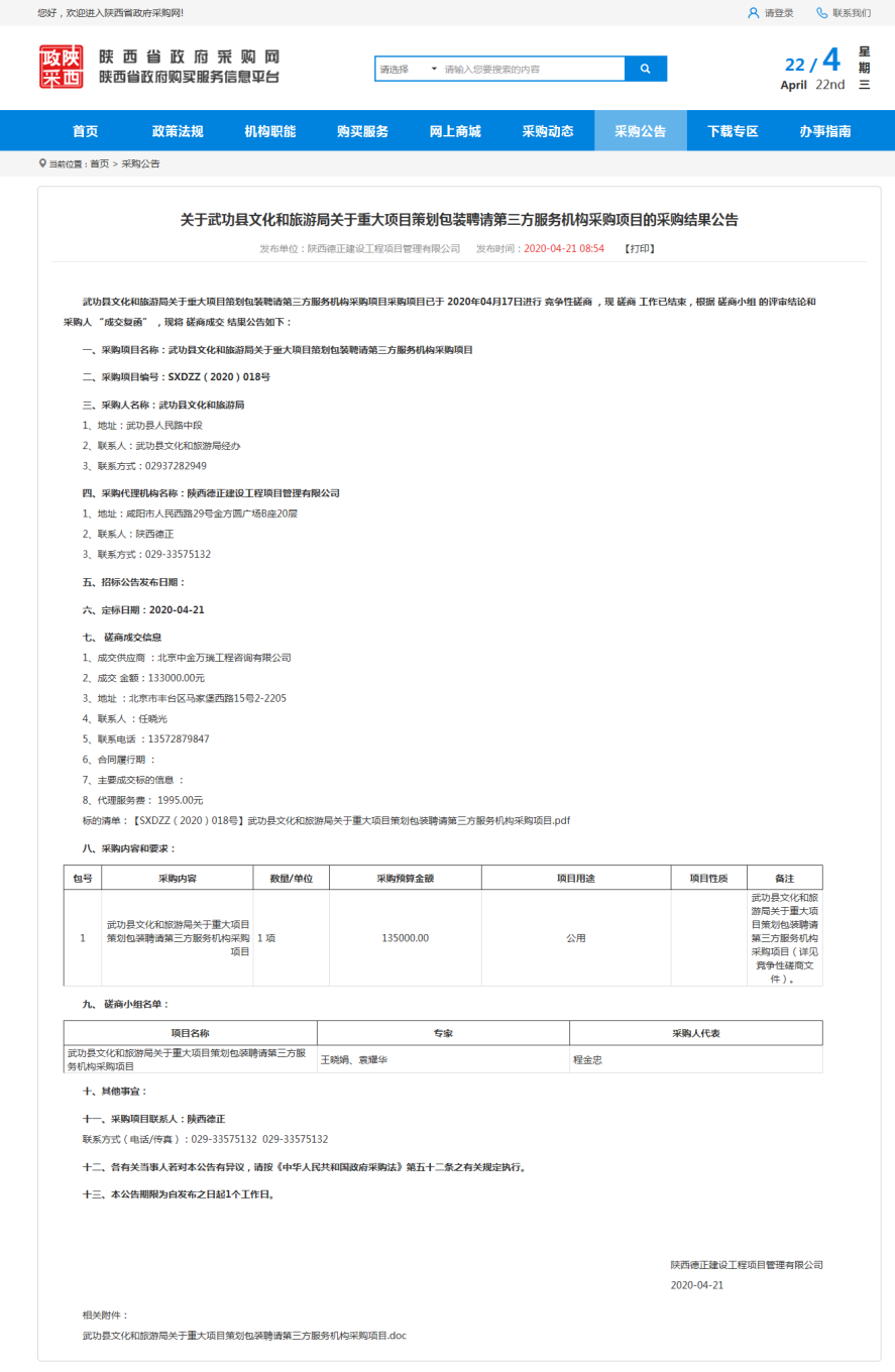2020年4月21日陕西省政府采购网发布于武功县文化和旅游局关于重大项目策划包装聘请第三方服务机构采购项目的采购结果公告,天行网页版页面成功中标。 天行网页版页面(简称中金万瑞)是全国57家工程咨询甲级综合资信企业之一,拥有专业资信甲级8项、PPP专项资信甲级和综合资信甲级(所有专业规划咨询和评估咨询)。公司是国际咨询工程师联合会(FIDIC)、中国工程咨询协会的会员单位。 在项目谋划领域,公司组建有项目谋划和包装策划的专业研究团队,依托公司投资项目库和六大服务平台的资源优势,为各级政府、投资者提供区域投资项目谋划、投资项目包装策划、投资项目库建设、项目投融资方案设计等咨询服务。 在前期咨询领域,公司凭借工程咨询甲级综合资信的队伍及实力,为项目单位提供项目建议书、可行性研究报告、项目申请报告、资金申请报告、节能报告、PPP项目咨询、社会稳定风险评估、项目实施方案、项目评估评审等咨询服务。
