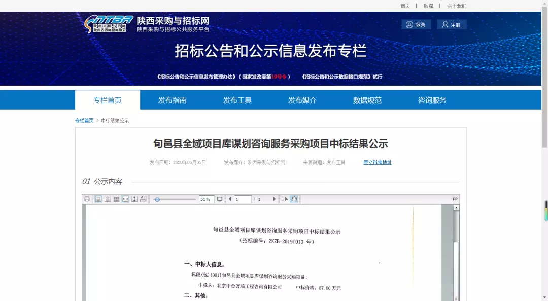 2020年6月5日,陕西采购与招标网发布《旬邑县全域项目库谋划咨询服务采购项目中标结果公示》,我公司成功入围。