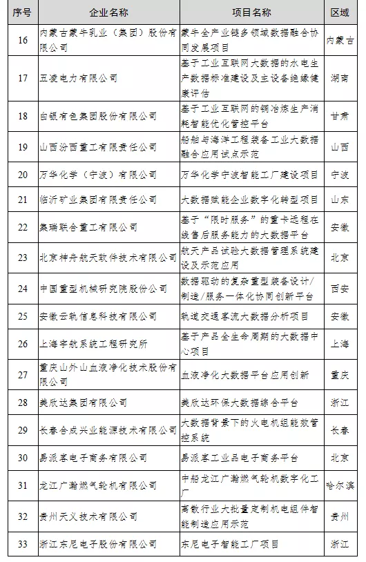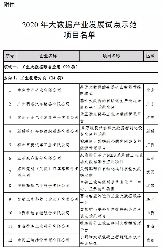 为贯彻落实《国务院关于印发促进大数据发展行动纲要的通知》(国发〔2015〕50号)和《大数据产业发展规划(2016-2020年)》(工信部规〔2016〕412号),按照《工业和信息化部办公厅关于组织开展2020年大数据产业发展试点示范项目申报工作的通知》(工信厅信软函〔2019〕243号)要求,经各单位推荐、专家组评审、网上公示,确定“中色非洲矿业有限公司基于大数据的金属矿山智能管控新模式”等200个项目为2020年大数据产业发展试点示范项目,现予以公布。