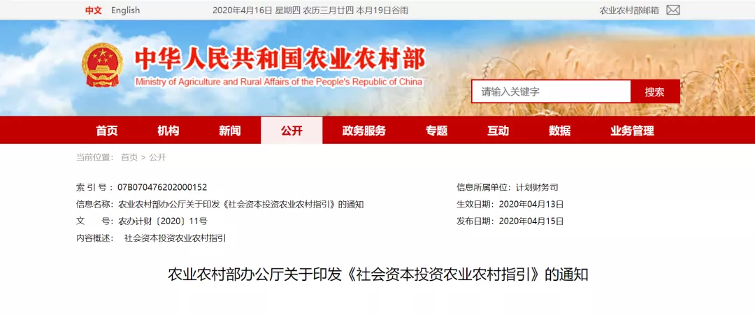 农业农村部办公厅关于印发《社会资本投资农业农村指引》的通知