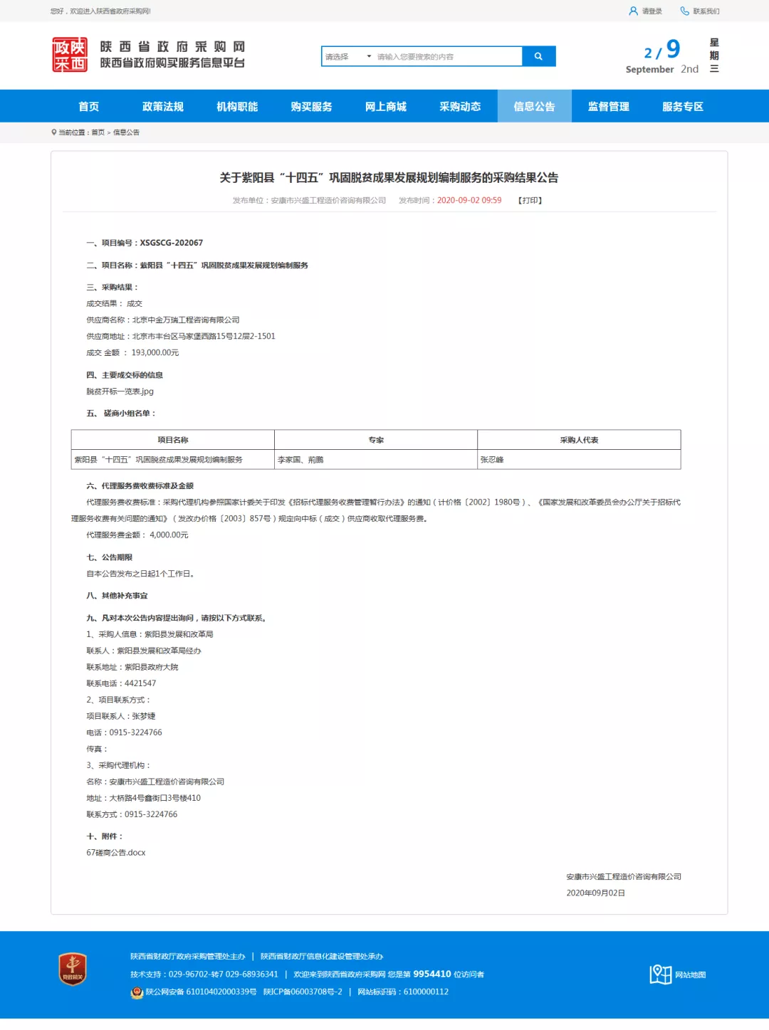 2020年9月2日,陕西省政府采购网发布《关于紫阳县“十四五”巩固脱贫成果发展规划编制服务的采购结果公告》,我公司成功中标,中标金额193,000.00元。