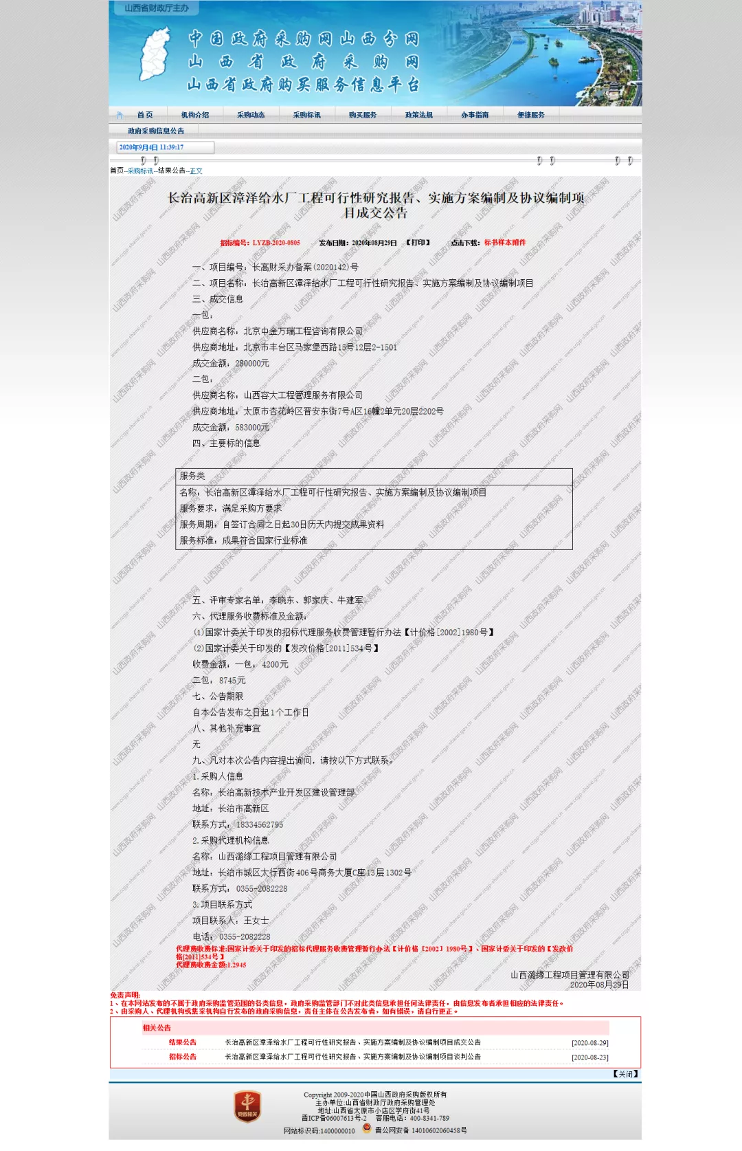 2020年8月29日,山西省政府采购网发布《长治高新区漳泽给水厂工程可行性研究报告、实施方案编制及协议编制项目成交公告》,我公司成功中标,中标金额280,000.00元。