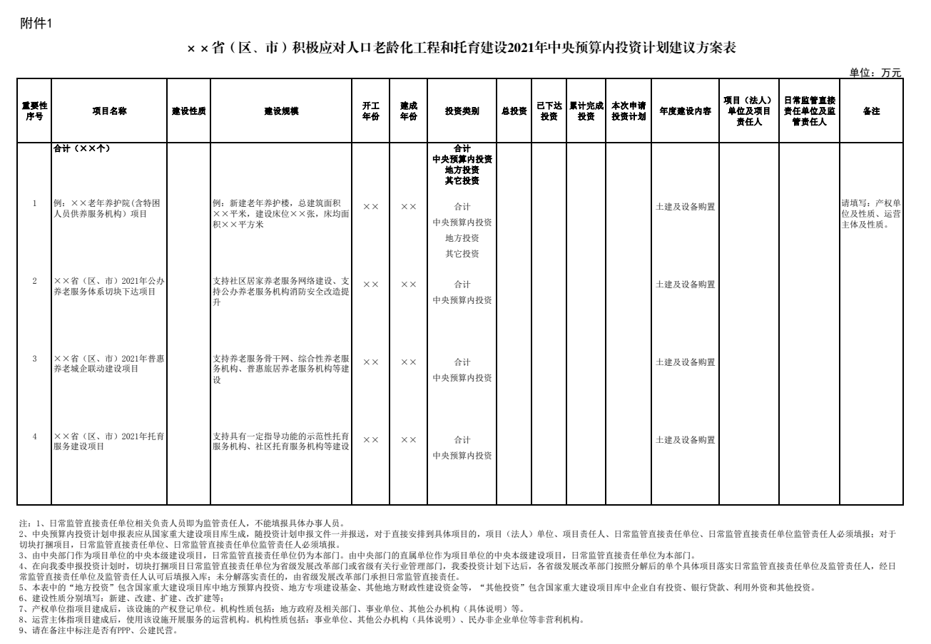 附件:1.积极应对人口老龄化工程和托育建设2021年中央预算内投资计划建议方案表