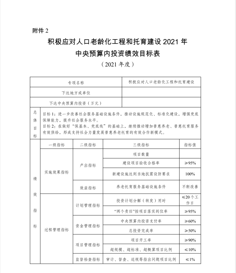 2.积极应对人口老龄化工程和托育建设2021年中央预算内投资绩效目标表