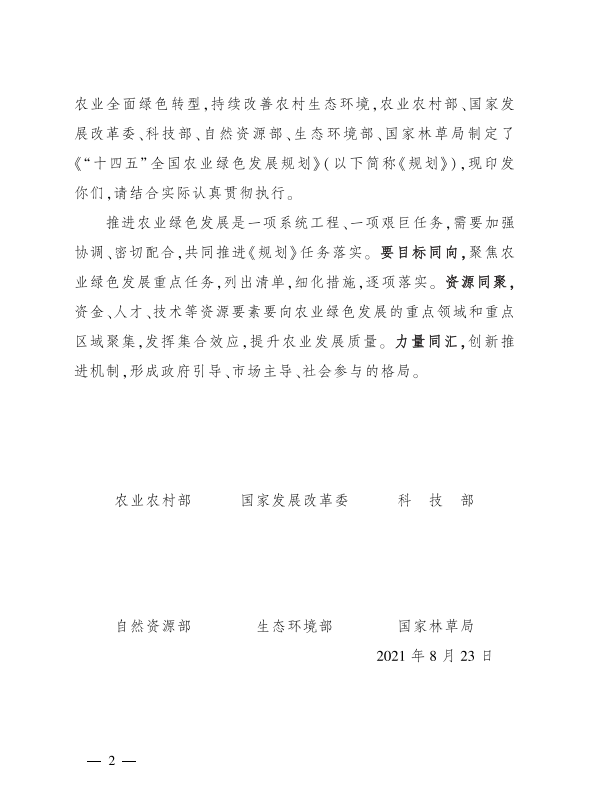 为贯彻落实党中央、国务院推进农业绿色发展决策部署,加快农业全面绿色转型,持续改善农村生态环境,农业农村部、国家发展改革委、科技部、自然资源部、生态环境部、国家林草局制定了《“十四五”全国农业绿色发展规划》(以下简称《规划》),现印发你们,请结合实际认真贯彻执行。