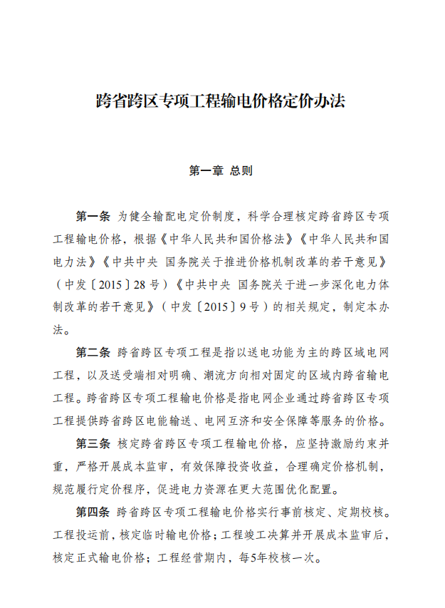 为贯彻落实中共中央、国务院《关于进一步深化电力体制改革的若干意见》、《关于推进价格机制改革的若干意见》要求,加快深化电价改革,进一步提升跨省跨区专项工程输电价格核定的科学性、合理性,经商国家能源局,我们对2017年出台的《跨省跨区专项工程输电价格定价办法(试行)》(发改价格规〔2017〕2269号)作了修订,形成了《跨省跨区专项工程输电价格定价办法》。现印发你们,请按照执行。