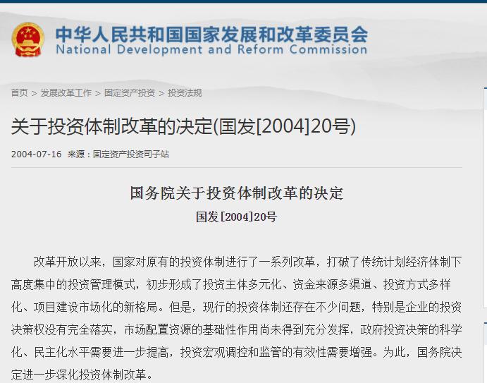 国务院关于投资体制改革的决定国发〔2004〕20号各省、自治区、直辖市人民政府,国务院各部委、各直属机构:改革开放以来,国...