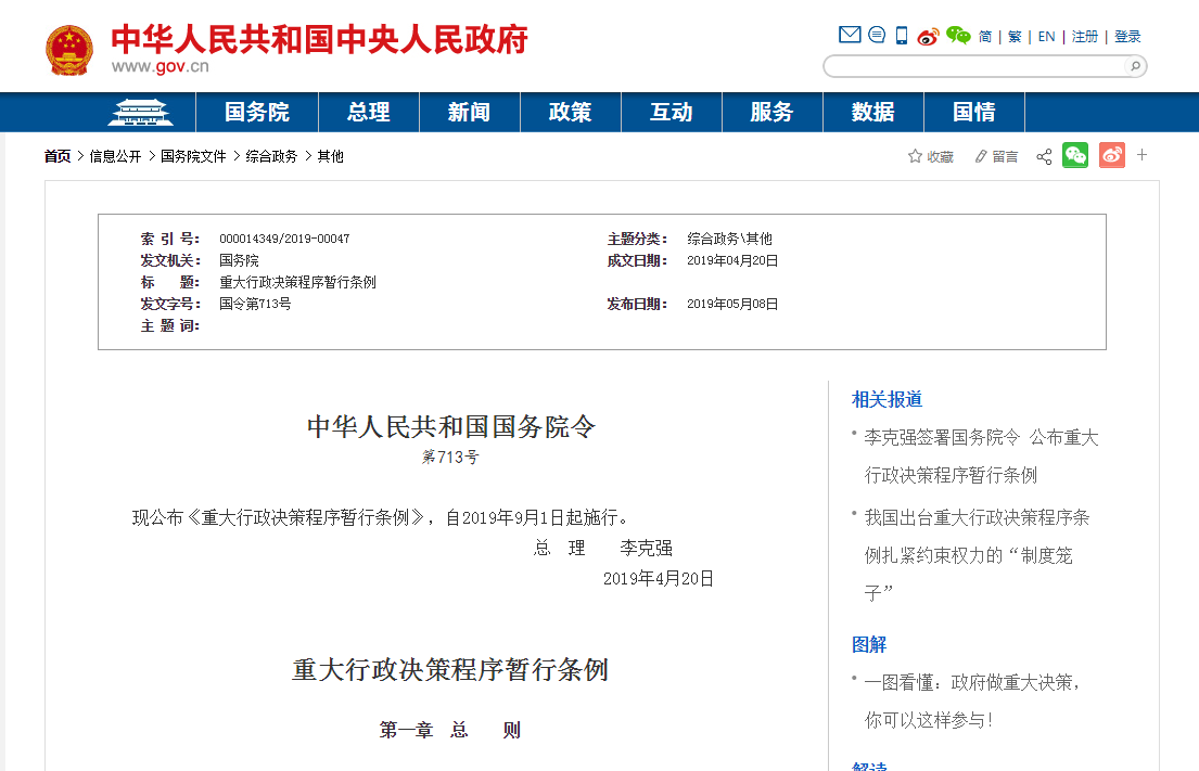 中华人民共和国国务院令第713号现公布《重大行政决策程序暂行条例》,自2019年9月1日起施行。总理李克强2019年4月20日重大行...
