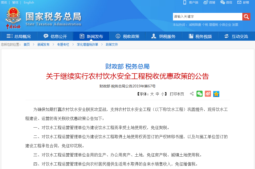 财政部税务总局关于继续实行农村饮水安全工程税收优惠政策的公告财政部税务总局公告2019年第67号为确保如期打赢农村饮水安全...