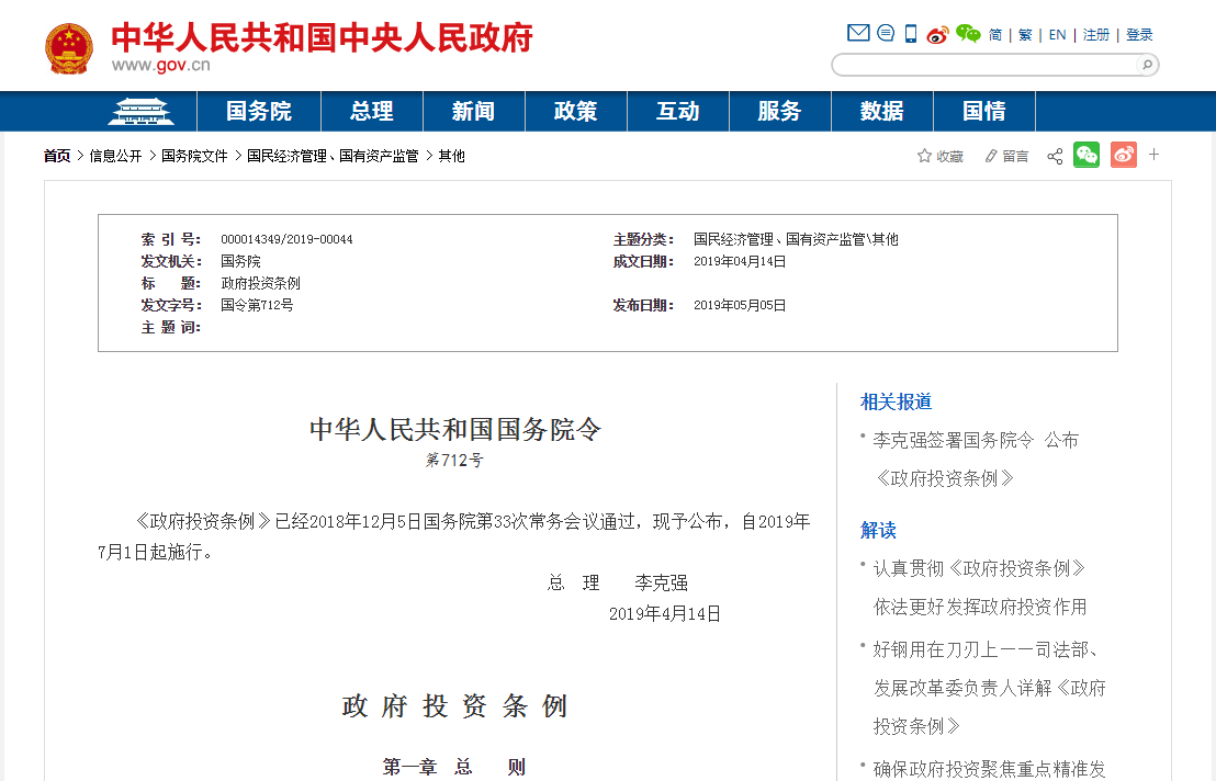 中华人民共和国国务院令第712号《政府投资条例》已经2018年12月5日国务院第33次常务会议通过,现予公布,自2019年7月1日起施...