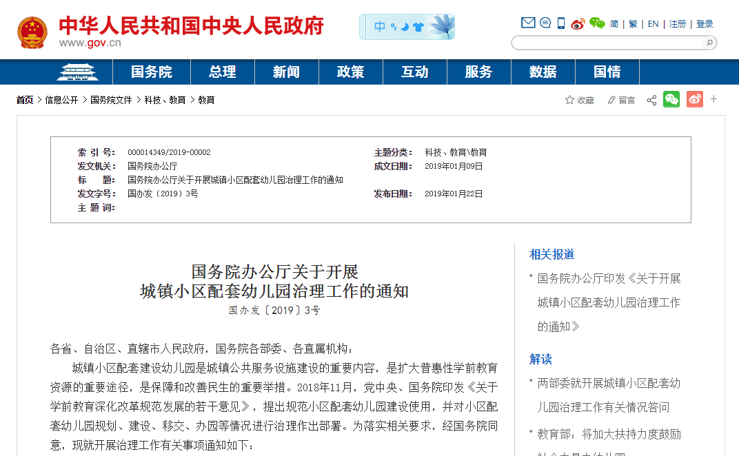 国务院办公厅关于开展城镇小区配套幼儿园治理工作的通知国办发〔2019〕3号各省、自治区、直辖市人民政府,国务院各部委、各直...