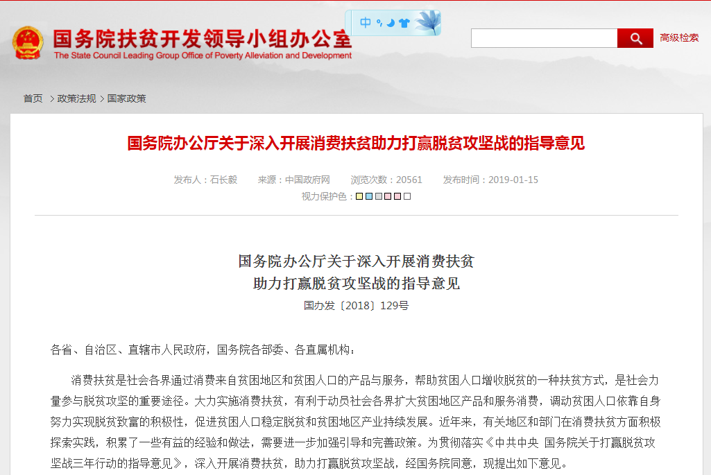 各省、自治区、直辖市人民政府,国务院各部委、各直属机构:消费扶贫是社会各界通过消费来自贫困地区和贫困人口的产品与服务...
