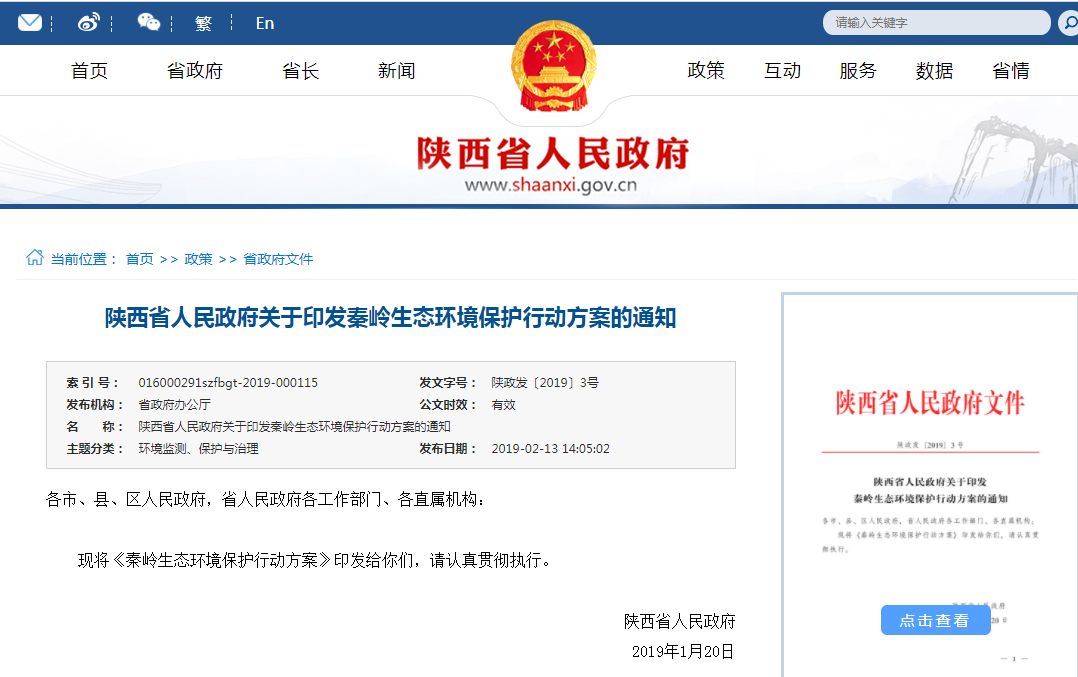 各市、县、区人民政府,省人民政府各工作部门、各直属机构:现将《秦岭生态环境保护行动方案》印发给你们,请认真贯彻执行。...